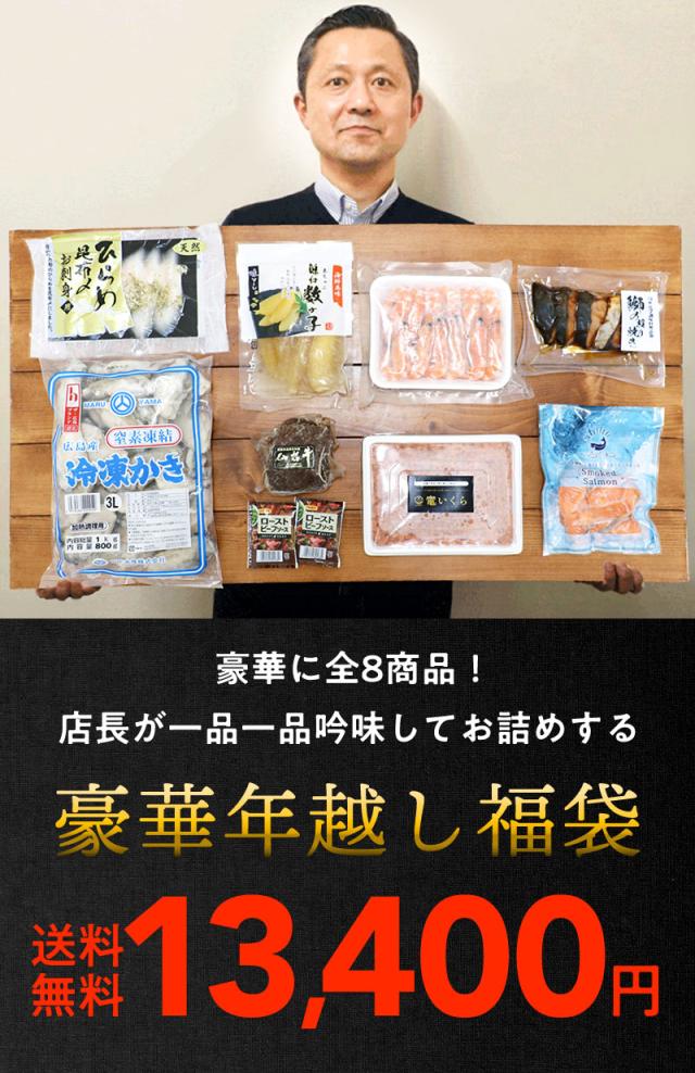 年越し福袋 年末年始を彩る高級食材8商品入ったお得過ぎる福袋 竈イクラ 味漬け数の子 仙台牛ローストビーフ 広島県産剥き牡蠣 有頭ボイル海老 無添加スモークサーモン 鰤の照り焼き 天然ひらめ昆布〆 お節 お歳暮