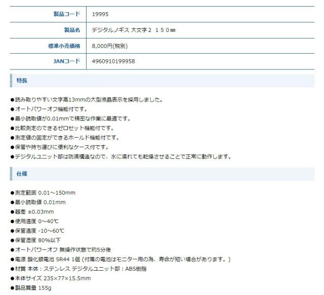 シンワ デジタルノギス 大文字2 品名150mm 製品コード19995 ケース付 外側測定 内側測定 深さ測定 段差測定 大型液晶表示 オートパワーオフ機能付 小型便 。