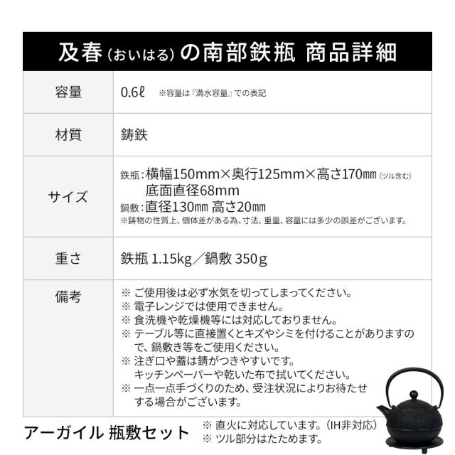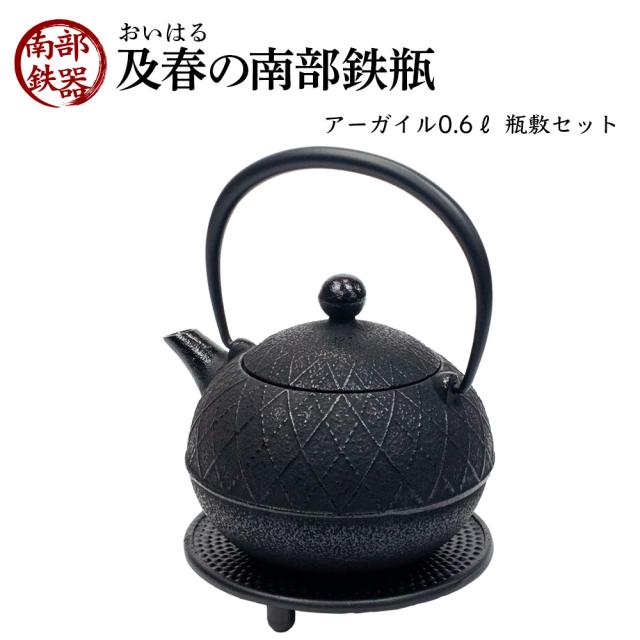 南部鉄瓶 及春(おいはる) アーガイル 0.6L 鉄瓶 瓶敷 セット南部鉄器 及春鋳造所 日本製 直火OK 鉄 急須