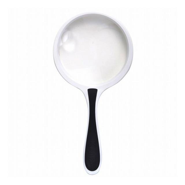 レンズ径100mm、手持ちルーペ最大サイズで広い範囲が見えやすい。白と黒のツートンカラーでシンプルデザインの手持ちルーペです。