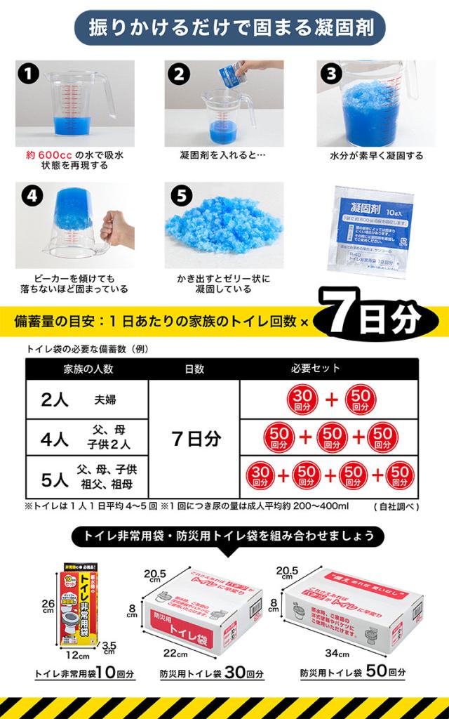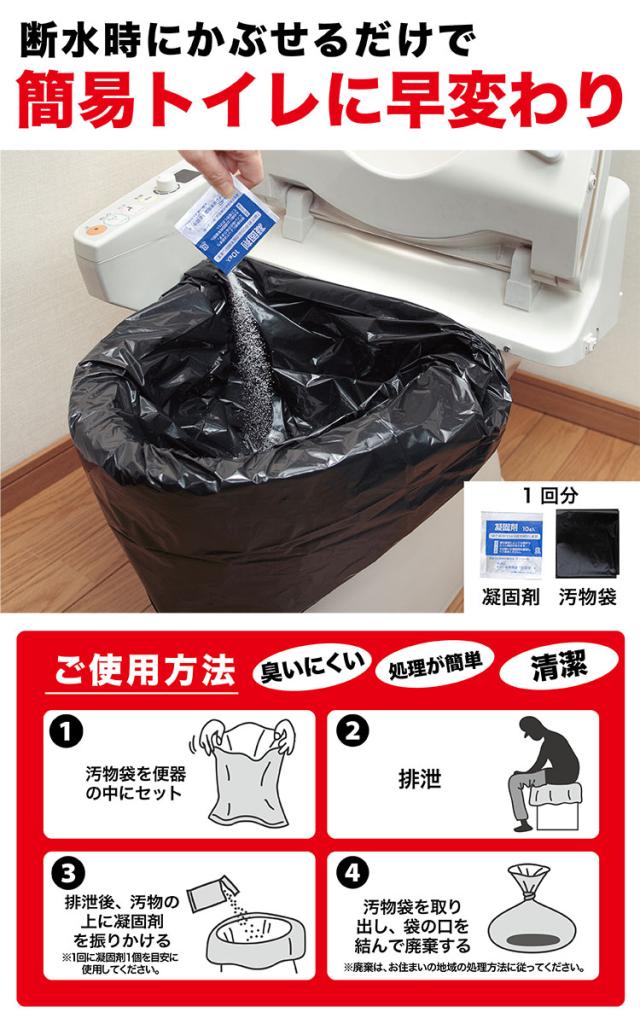 ●凝固剤で固めて、手を汚さず汚物処理で断水時のトイレにも使えます。