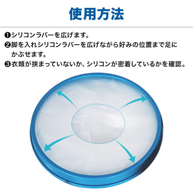 シリコンの開口部を指で広げ足を入れ、丁度いい位置まで上げるだけ!