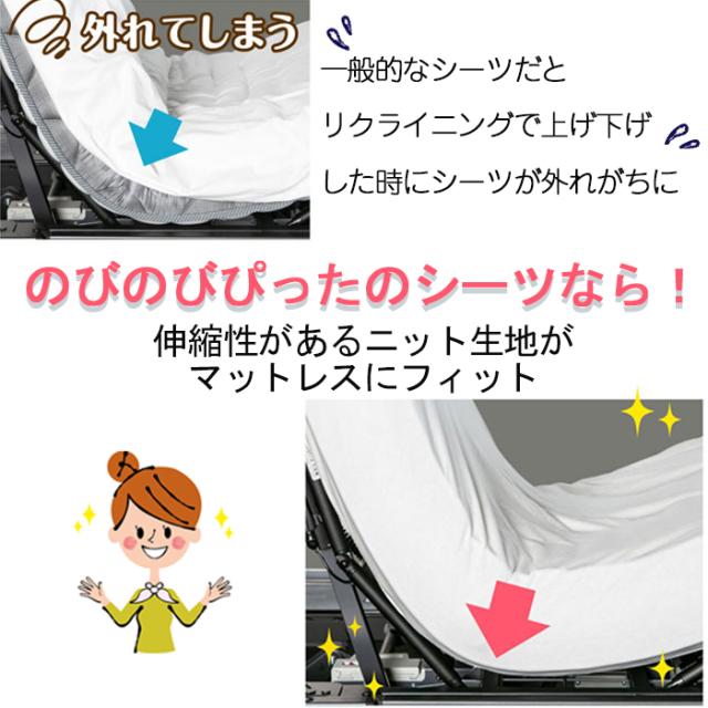 マットレスが曲がる電動ベッドや、電動リクライニングベッドをご利用の方にオススメなベッドシーツです。 安心の日本製、国内の工場で生産し、万全の品質管理で安心と安全をお届けします。