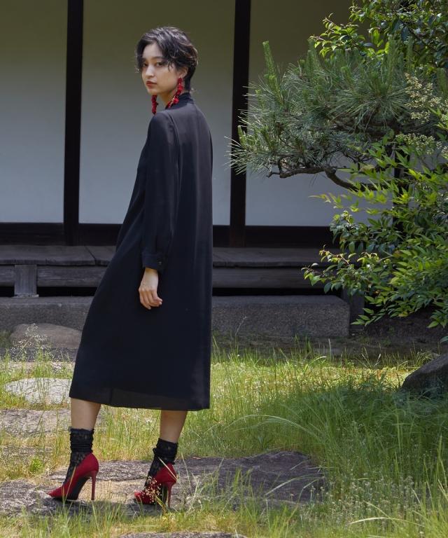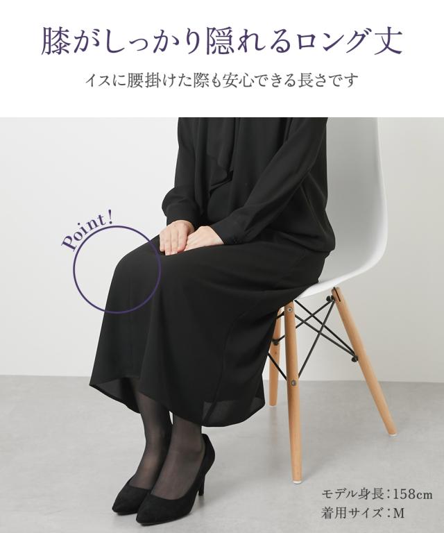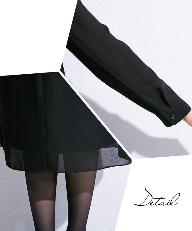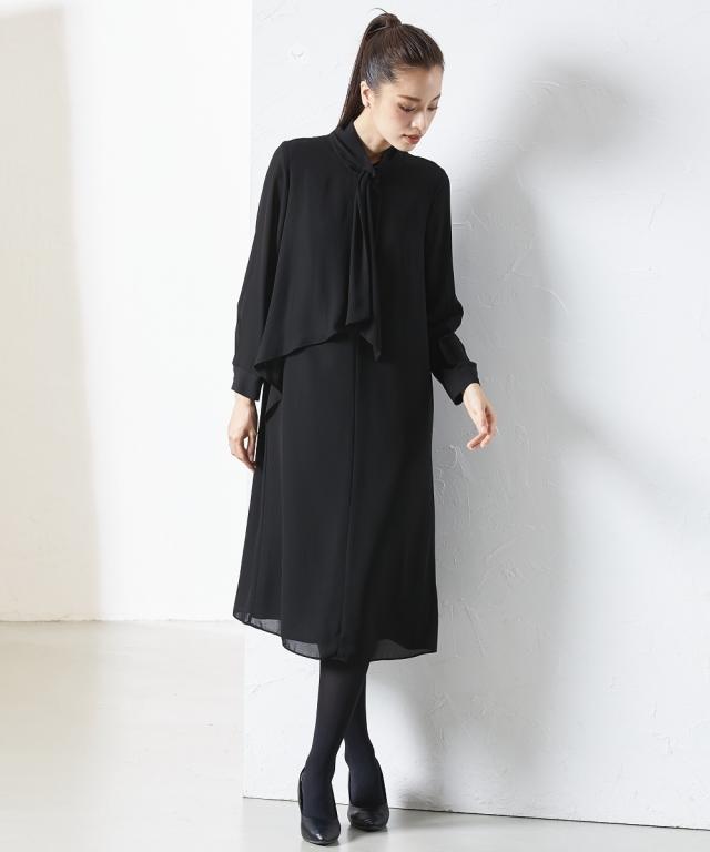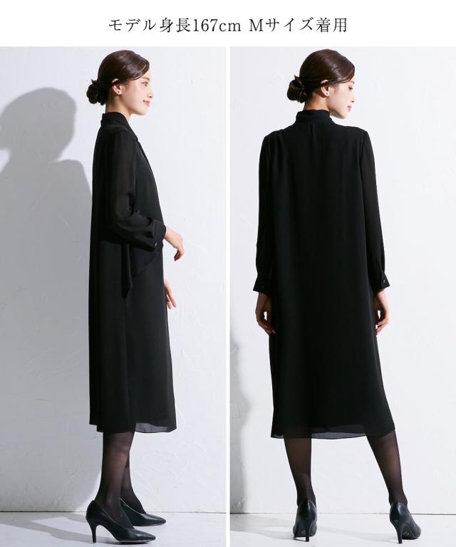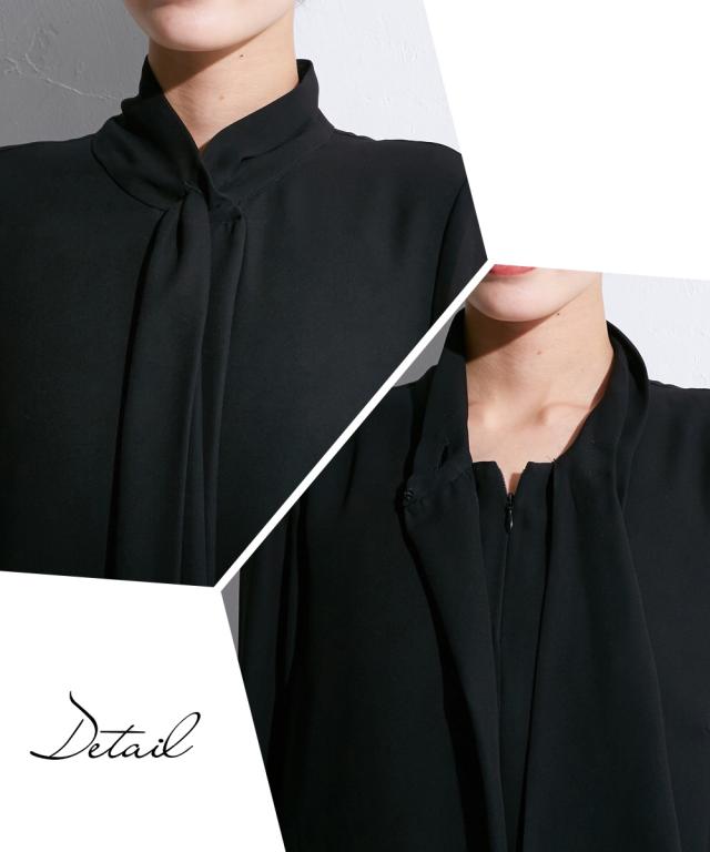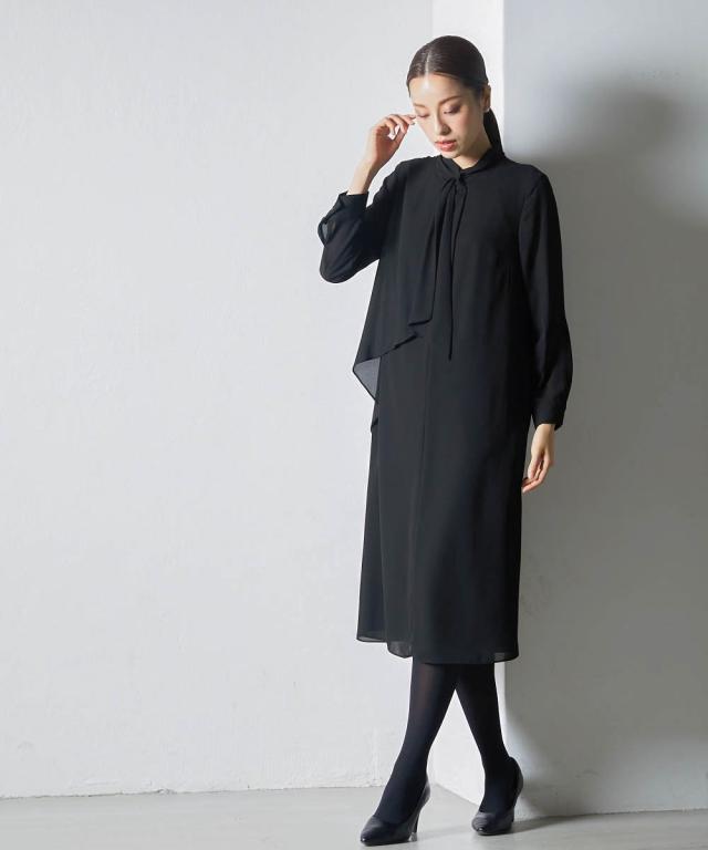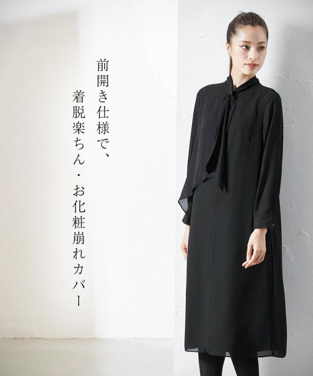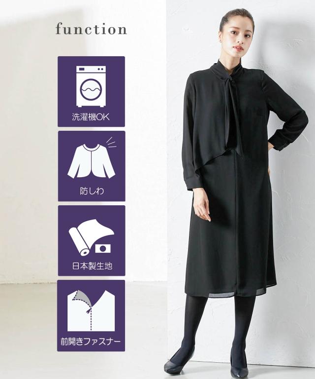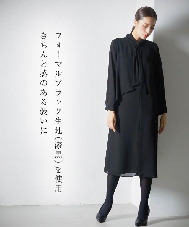上品かつ美しく大切な日を装うシーンを選ばないという今までにない価値観に基づいた新しいブラックフォーマルシリーズ★こだわりポイント上品かつ美しく大切な日を装う。シーンを選ばないという今までにない価値観に基づいた新しいブラックフォーマルワンピース家族葬などが増えた今、美しく特別な方の大切な日を装う固くなりがちの喪服に、こなれたデザインをプラスドレープ感が美しいフロントデザインスタンドカラーでスタイリッシュな印象に前開き仕様で、着脱楽チン・お化粧崩れもカバーこだわりの日本製ブラックフォーマル生地を使用ふんわり軽