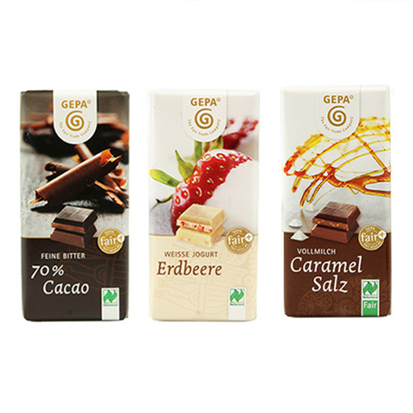 手軽に本格チョコをたのしめる個性豊かなラインナップ。 ゲパ社は1975年にドイツに設立され、創業以来40年以上に渡り、フェアトレードのパイオニア的存在として発展途上国の生産者をサポートする活動を続けてきました。生産者を大切なパートナーとする一貫した哲学を持ち、世界フェアトレード機構(WFTO)や独自基準である「フェアトレードプラス」の確立など、フェアトレードの最低基準を大幅に超えた活動に取り組んできました。 *一般的には20%以上でフェアトレード製品となります。