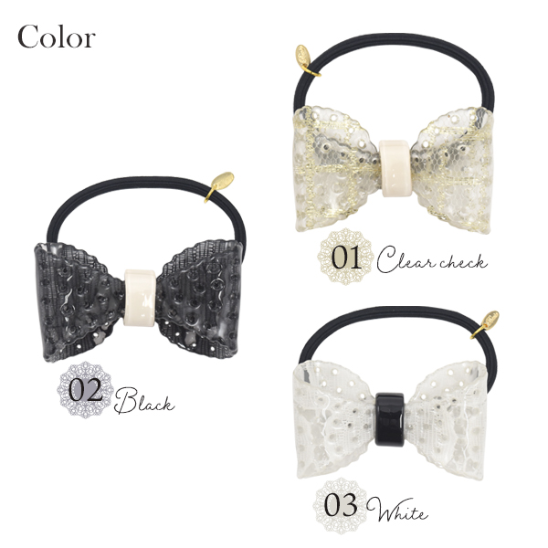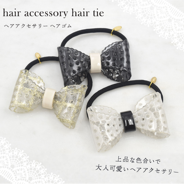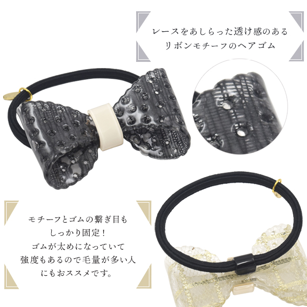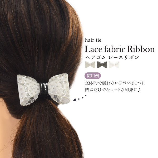 ヘアゴム レースリボン 上品 レース模様 ブラック ホワイト クリア 結ぶだけ 簡単 一つ結び かわいい 華やか まとめ髪