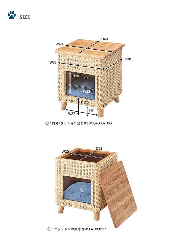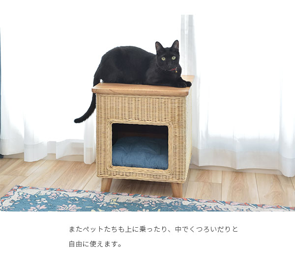 ラタン×天然木 ペットハウス / キャットハウス 猫ハウス 室内 ドーム型 座れる 猫ちぐら おしゃれ ラタン 籐 家具 猫用ハウス 小さい コンパクト 木製 天板付き かわいい クッション付き 猫のベッド