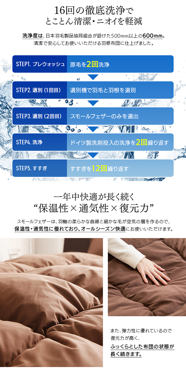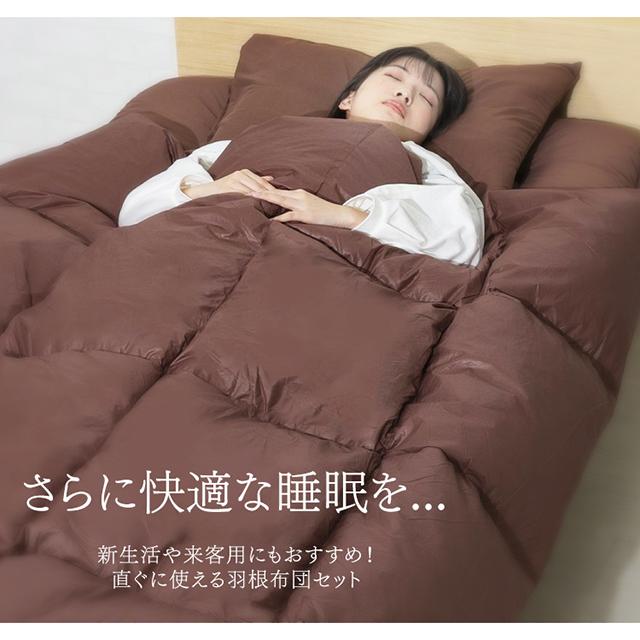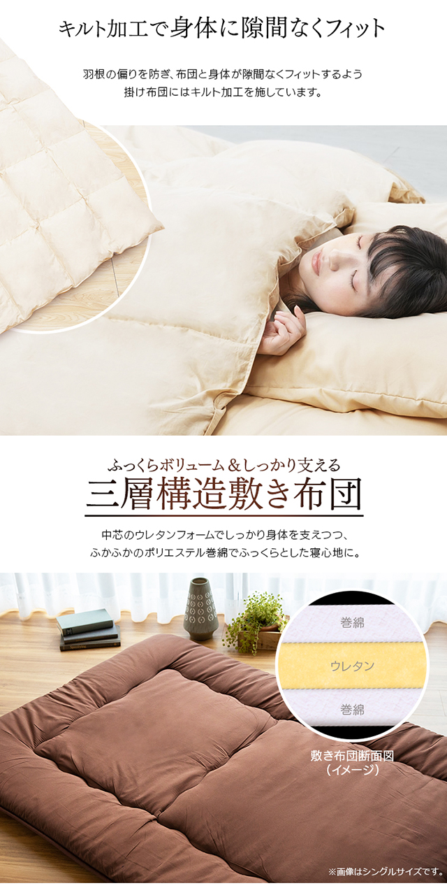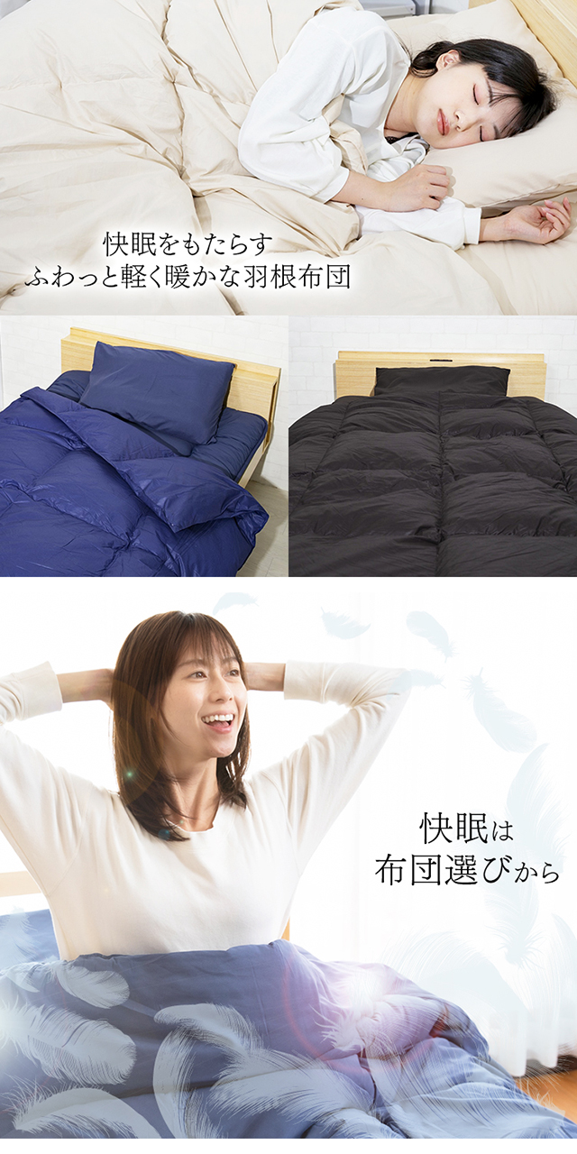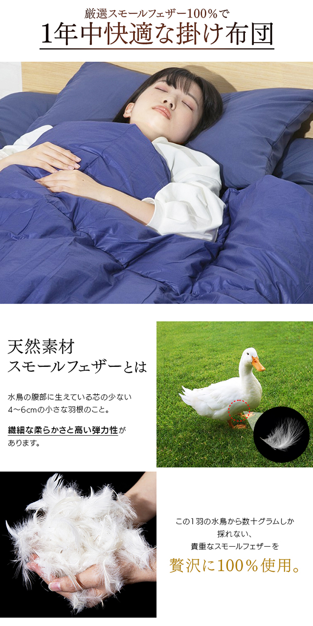 厳選スモールフェザー100%、掛け布団・敷き布団・枕・枕カバー+収納袋のお得な5点セットです。