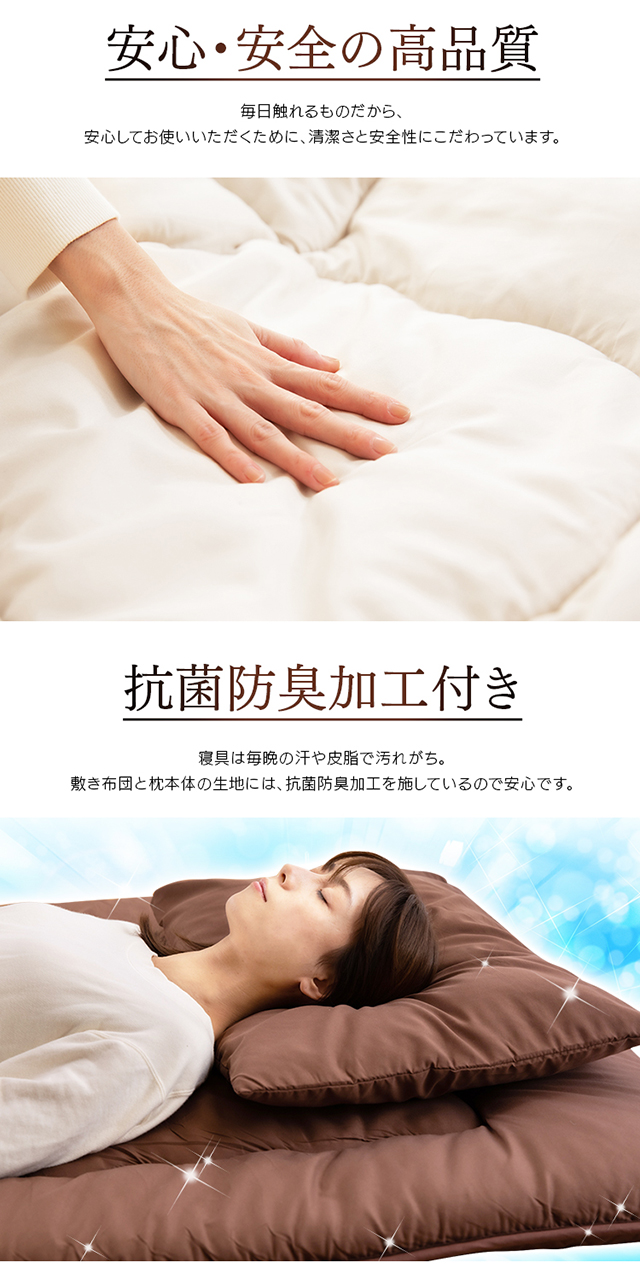 敷布団:側生地 ポリエステル100%(ピーチスキン・抗菌防臭加工)、詰物 ウレタン(厚さ2cm)+巻綿ヘム付