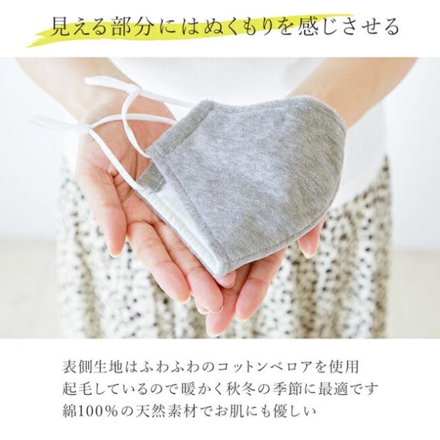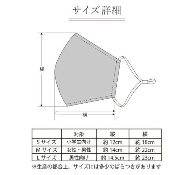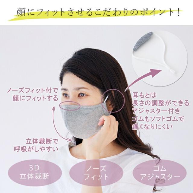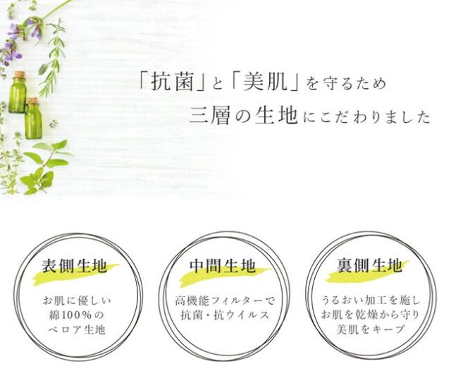| ・肌に当たる部分は綿100% 天然素材を使っているのでお肌に優しい ・シアバター、オリーブオイル、シルクアミノ酸 配合のしっとり潤い加工 ・マスクによる肌荒れや乾燥を防ぎ、お肌を守ってくれます ・表側生地はふわふわのコットンベロアを使用 起毛しているので暖かく秋冬の季節に最適 ・綿100%の天然素材でお肌に優しい ・立体裁断で呼吸がしやすい ・ノーズフィットで顔にフィットする ・耳もとは長さの調整ができるアジャスター付き ・ゴムはソフトゴムで耳が痛くなりにくい ・高性能フィルターで飛沫をブロック!こだわりの三層構造 ・お食事の時に便利なマスクケースがセットで付いてきます やわらかい素材なので、ポケットやバッグに小さくして収納できます ・くり返し洗って使用出来るので、衛生的で安心です ・みんなで選べる3サイズ展開 スモーキーピンク:肌の血色をよく見せてくれる女性にうれしいカラー キャメルブラウン:赤味のある落ち着いたブラウンなので肌色を明るく見せてくれる グレー:ベーシックな杢グレーなので、どなたでも使いやすい ※マスクは感染(侵入)を完全に防ぐものではありません |