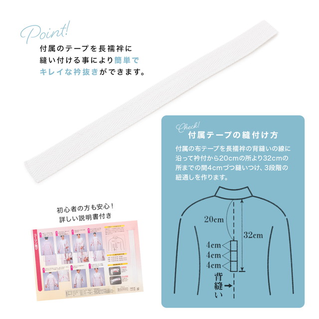付属のテープを長襦袢に縫い付ける事により簡単に衿抜きができます。