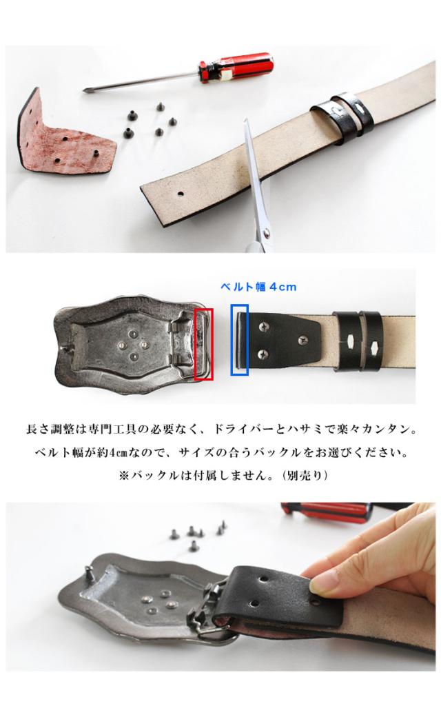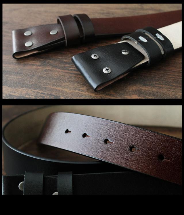 ■商品説明:本革を使用して製作したレザーベルトです。ネジ式でバックルが留められるようになっているのでお好みのバックルを付けて使用することができます。※ピン型バックルを取り付ける場合は縦型の穴空けが必要です。