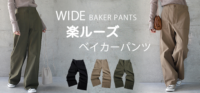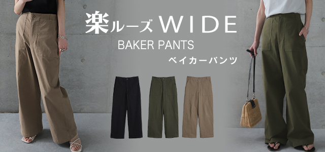 ワイドなラインなので体型カバーにもなるベイカーパンツ。