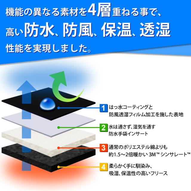 雨や雪の日も、風の強い日も、抜群の暖かさを保ちながら手袋の中は蒸れにくい。