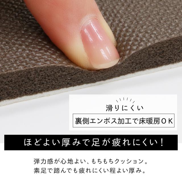 程よい厚みとクッション性のあるソフトな踏み心地で、長時間の立ち仕事による足への負担を軽減します。