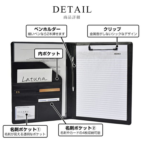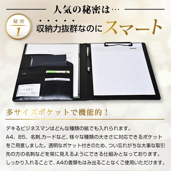 透明なポケット付きのため、つい忘れがちな大事な取引先の方の名刺などを常に見えるようにできる仕組みとなっております。