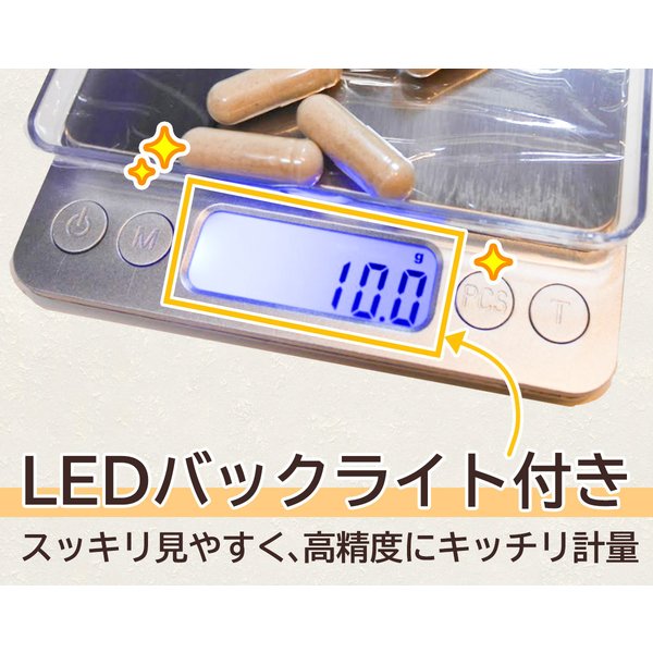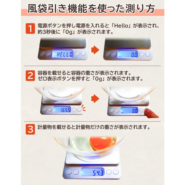 風袋引き機能も付けました。重さを表示するLCD液晶にバックライトを搭載しさらに見やすくしました!