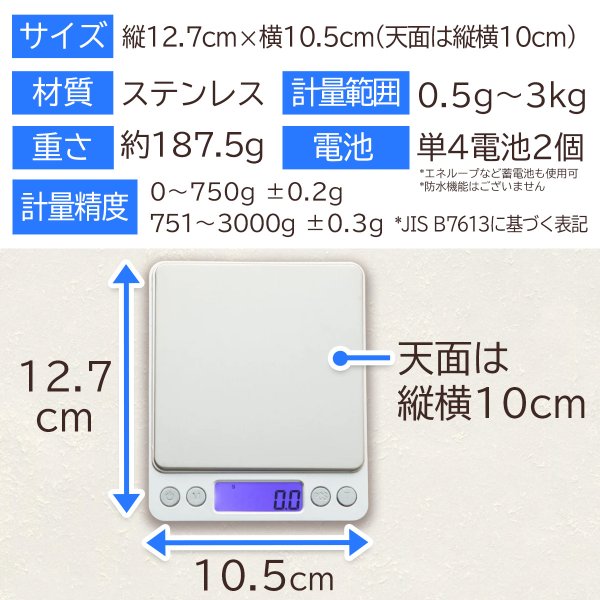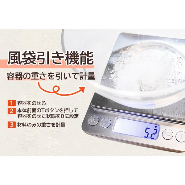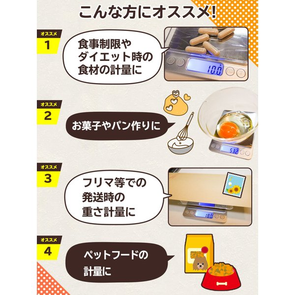 お菓子やパン作りに、調合に、動物の餌の計測に、郵送物の重さ測定に幅広い用途でお使いいただけます。