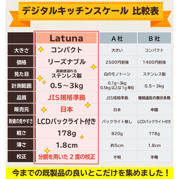 Latunaデジタルキッチンスケールは、お客様からいただいたお声をもとに改良して作られた最新版です。