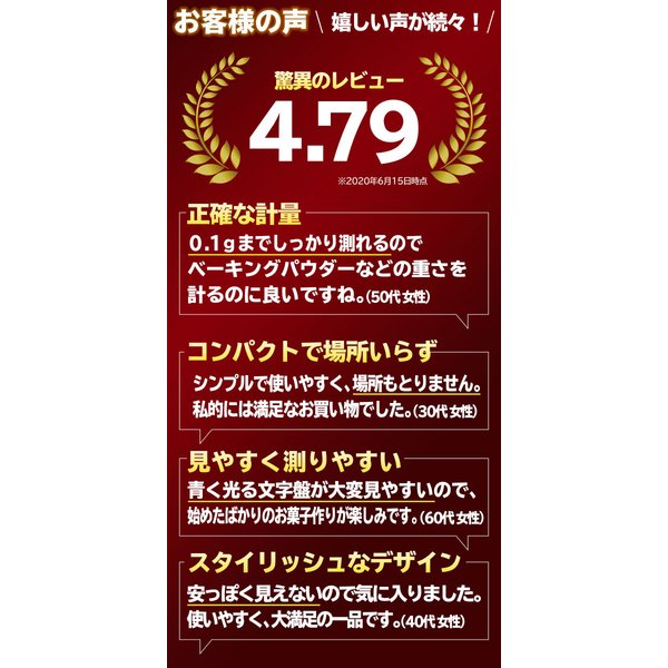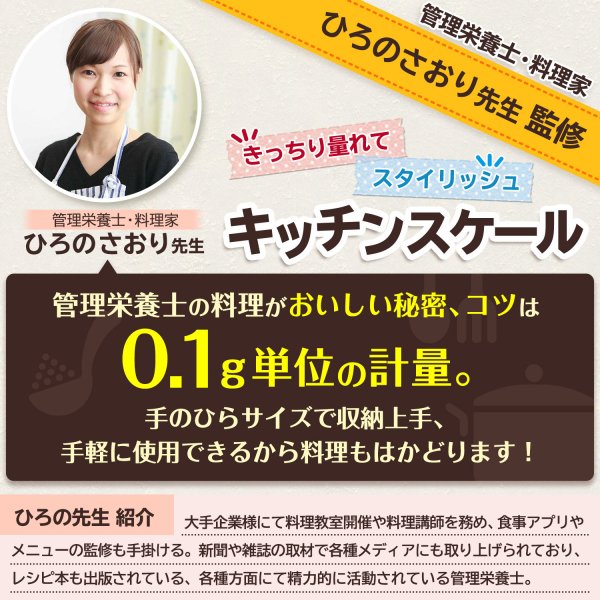- 食事管理をしているため、0.1g単位で計れるものを探していました。 お値段もお手頃で大満足です!