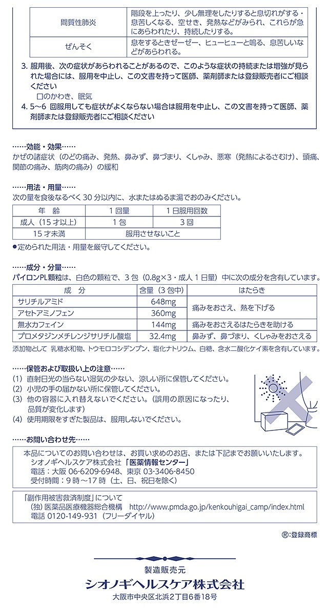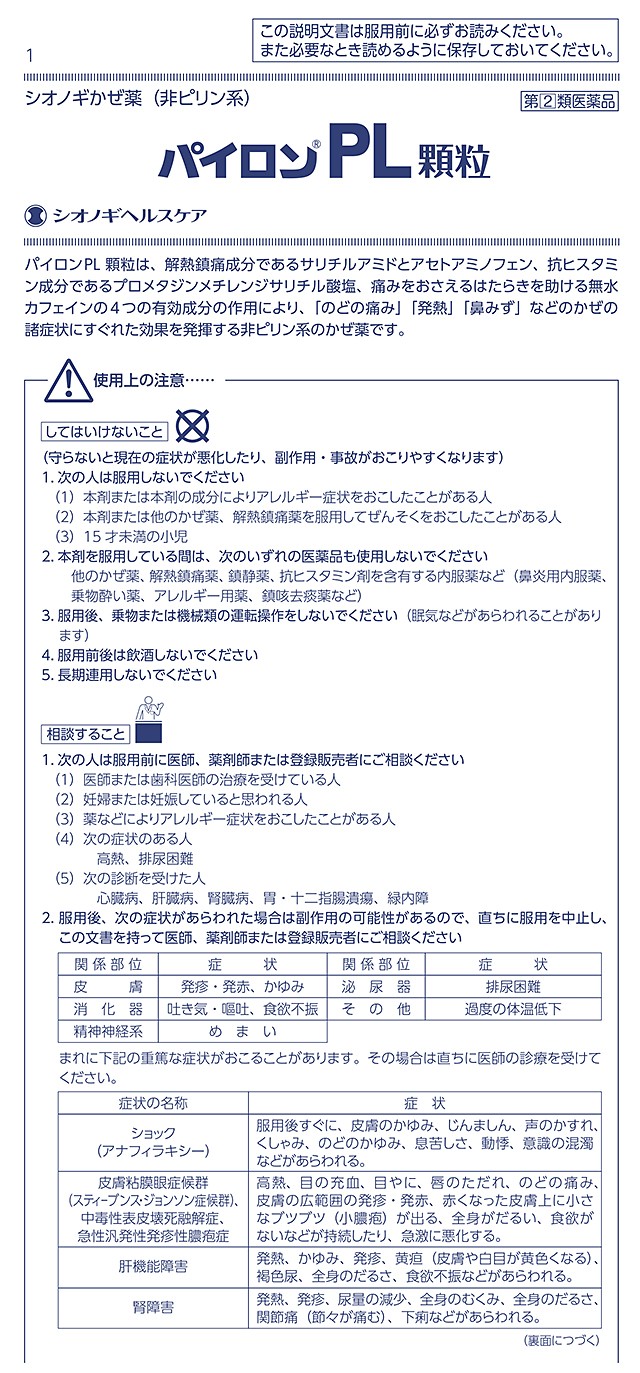 商品名 指定第2類医薬品 パイロンPL顆粒 24包 2個セット ※セルフメディケーション税制対象商品 容量 24包×2個:合計48包 メーカー シオノギヘルスケア カテゴリー 医療・介護・医薬品>医薬品>風邪薬>風邪薬【第一・二類医薬品(指定第二医薬品含む)】 効果・効能 かぜの諸症状(のどの痛み、発熱、鼻水、鼻づまり、くしゃみ、悪寒(発熱による寒気)、頭痛、関節の痛み、筋肉の痛み)の緩和 用法・用量 次の量を食後なるべく30分以内に、水またはぬるま湯でおのみください。