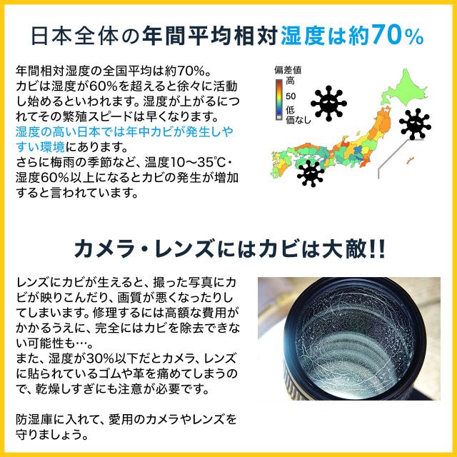 ●カメラやレンズの大敵であるカビの発生を防ぐ防湿庫です。●庫内の湿度を一定に保ちます。