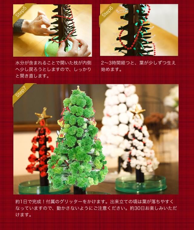 ・マジックウォーターを注ぐと葉がモコモコと成長し、ふわふわのクリスマスツリーが完成します。