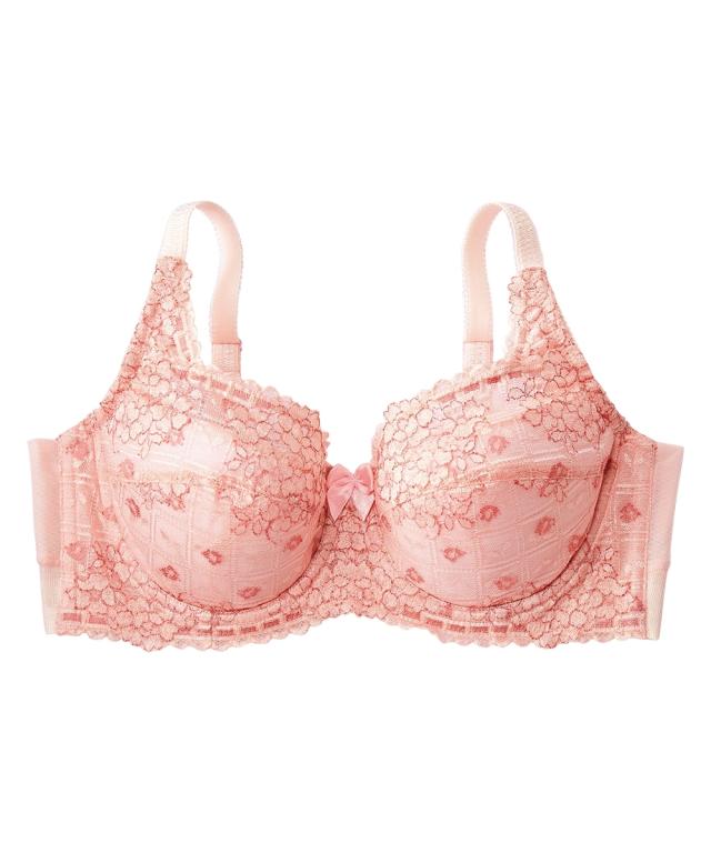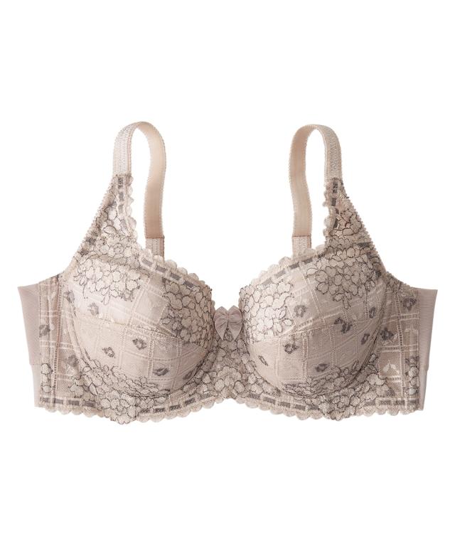大きな胸も安定感よく包みこむフルカップブラ。幅広のアンダー上辺は折り返し、下辺はヘム仕様でくいこみを防いでラクな着用感。アウターにもひびきにくい仕様です。伸縮性のあるストラップで肩もラク。
