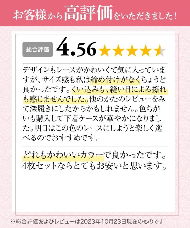[keyword] 下着 ランジェリー インナー レディース 標準サイズ 普通サイズ プラスサイズ レギュラー丈 レース付き おしゃれ ストレッチ 伸び コーディネートできる コーデ 組み合わせ お買い得セット まとめ買い セット お得 お買い得 オールシーズン コーディネート ショーツ パンツ 花柄 刺繍 刺しゅう 福袋 枚組 20代 30代 40代 50代 60代 M L LL [comment] 華やかショーツ4枚組 【おすすめポイント】 ・豪華な花柄刺しゅうのショーツがデイリー使いに嬉しい色違い4枚組 ・同じ形で揃うから、クローゼットもすっきり 【こんな方におすすめ】 ・洗い替え用として揃えたい ・まいにち着るものだからコスパも重要! ・ブラジャーとショーツのサイズを自由に選びたい 【商品特徴・機能】 ・縦横ストレッチ生地でフィット感◎ ・肌にあたるマチ部分は綿混素材で肌あたりやさしい 【デザイン】 ・2色糸を使用し繊細でゴージャスな花柄刺しゅう ・色違いのセットだから毎日選ぶのも楽しい ※商品の色移りを防止するために個包装を行っている場合がございます。 個包装はプラスチック削減のため一部の色のみに使用しています。