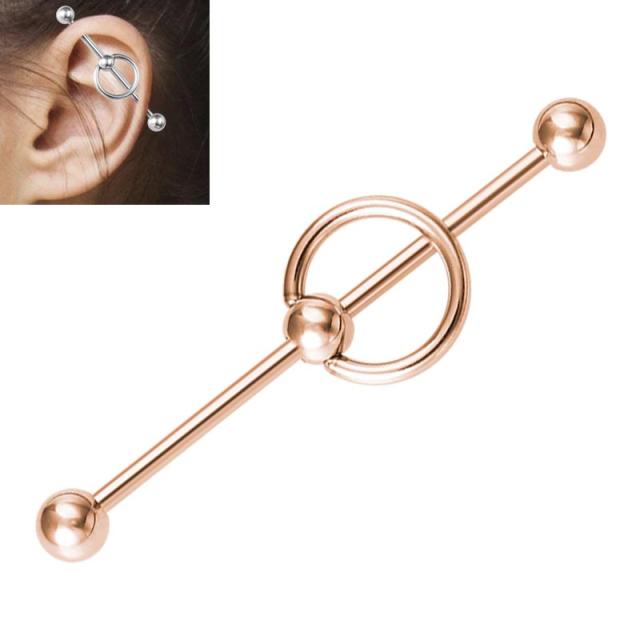 キャプティブビーズリング型のスレーブリングパーツを14ゲージの長いバーベルに通した個性的なインダストリアル用ボディピアス。