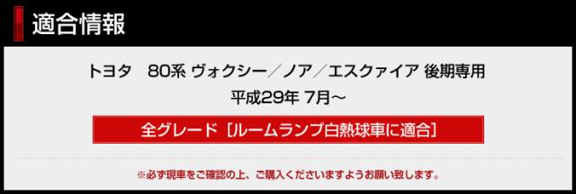 | 適合 | トヨタ 80系ノア/ヴォクシー/エスクァイア後期 平成29年7月〜 全グレード[ルームランプ白熱球車に適合] |