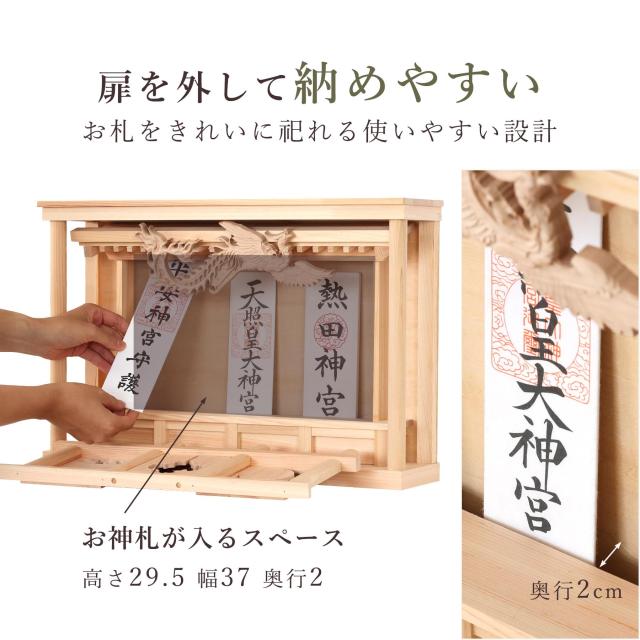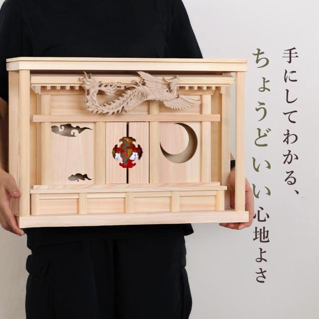 3枚までのお神札が収めやすい、三社宮の形構造となっています。一般のご家庭から店舗、事務所、会社などに適した、存在感のあるサイズ。壁掛け用フックが背面上部に付属しています。皆様の門出に合わせて華やかで豪華な祭壇を。「龍神」の彫刻をあしらった、同モデルの製品もございます。