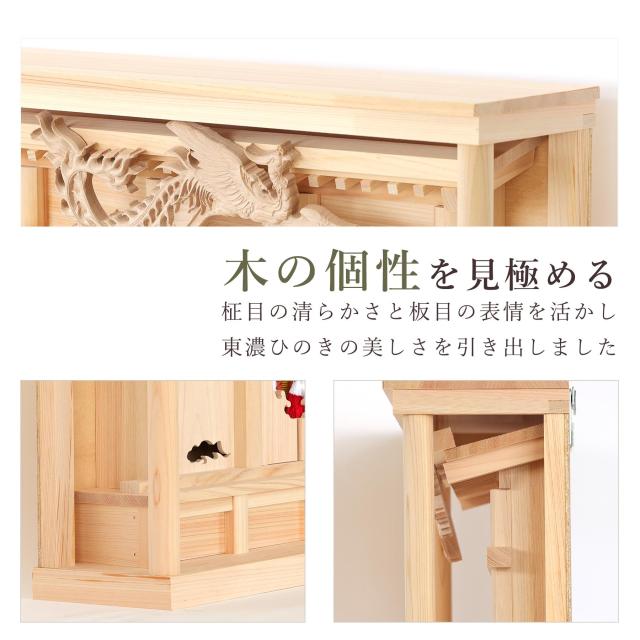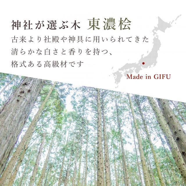 桧の生息域、北限に近い岐阜県産の「東濃桧」は白味の強い特上の材。なかでも選別された材を柾目と板目に使い分け、しっかりと設計、ゆっくりと丁寧に組み上げられています。木目の風合いとエッジの効いたデザインは、お部屋を清楚に神々しく、雰囲気作り。