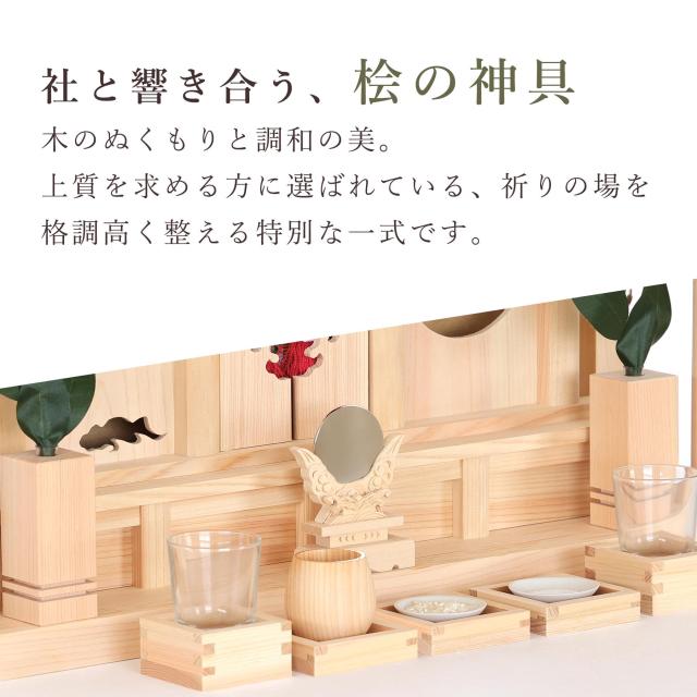 神具には素焼き陶器とグラス、桧材の組み合わせ、「和」のテイストあふれる一式です。神様へのお供え物も、きれいな器に入れて、心を込めて。モダンと「いにしえ」が融合する、神棚セット。