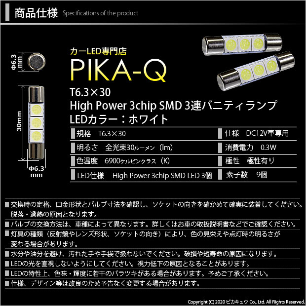 高輝度高拡散 HYPER 3chip SMD LEDを3個搭載したバニティランプ。サンバイザーのミラー部分のバニティランプ(バイザーランプ)に多く採用されているヒューズ型の特殊電球の互換。31mmバニティランプ(規格T6.3×31mm)に適合。
