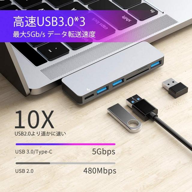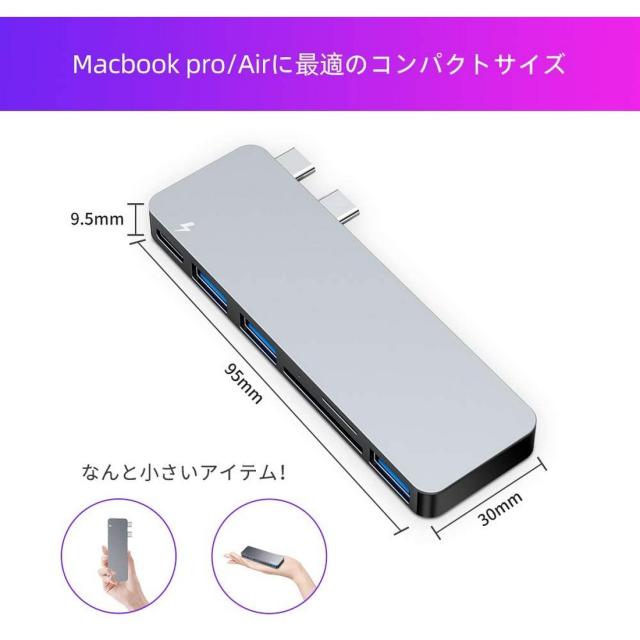 | ・サイズ:12.8*6.6*2cm ・重量:50g ・2020年新発売コード無し6in1 USB-C ハブ:製品の強み:本商品はPD充電対応のUSB Type Cポート×1、 Micro SDスロット ×1、SDスロット×1、USB 3.0×3、合わせて6つの差込口が搭載されています。 ・高速転送対応のUSB3.0&SDスロット:USB3.0が3つ搭載され、(USB2.0/1.0も適用)OTG機能、キーボード、マウス等に対応し、搭載されたSD/マイクロSDカードリーダーも市販のメモリカードをサポートする。更に87W出力対応のPD急速充電ポートを搭載し、バッテリー残量気にせず仕事や娯楽が可能です。 ・87W PowerDelivery急速充電:87W出力対応のPD急速充電ポートを搭載し、バッテリー残量気にせず仕事や娯楽が可能。逆電流保護、過大電流衝撃保護、電圧過負荷保護等の多重保護が有る為、ご安心に利用ください。 ・簡単な使用方法&高品質の作り:本体のType CコネクタをマックのThunderbolt3に接続するだけで直ぐに使えます。優れたアルミ合金素材、堅牢ながら軽量というメリットが目立っています。使いやすいデザインで外出にも便利です。取扱説明書には更新されておりません、最新のMacbook Pro Airの2018/2019/2020にまで対応できます。 ・機種対応:MacBook Pro 2016/2017/2018/2019/2020 MacBook Air 2018/2019/2020にも対応しております。 |