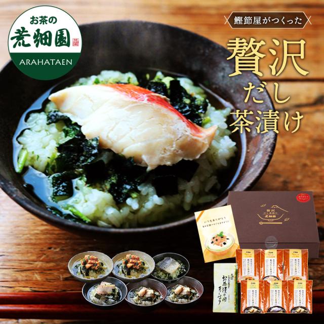 | 内容量 | 抹茶入玄米茶:18g(3g×6ヶ) 茶漬けの素 ほたて(具材:20g、茶漬けの素:6.2g)×2個、茶漬けの素 銀鮭(具材:20g、茶漬けの素:6.2g)×2個、茶漬けの素 金目鯛(具材:1切、茶漬けの素:6.2g)×1個、茶漬けの素 金華鯖(具材:30g、茶漬けの素:6.2g)×1個 |