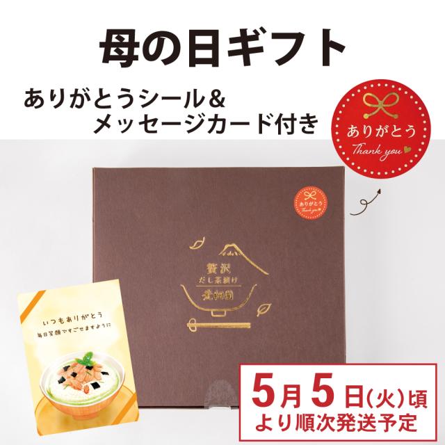 【超早割:ポイント10%】母の日 2026 ギフト 贅沢だし茶漬け6食 & お茶漬け用ティーパックセット 母 祖母 人気 上品 お茶漬け メッセージカード付き プレゼント 送料無料 静岡茶 お茶 緑茶 金目鯛×1袋、銀鮭×2袋、帆立×2袋、金華鯖×1袋
