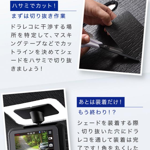 10.ドライブレコーダーは、ディーラーによって取り付け機種、取り付け位置が異なります。基本的にはドラレコ非対応ですが、自己責任でハサミやカッターを使ってドラレコに干渉しないよう加工が可能です。また、一部の機種では、シェードを上からかぶせることでフィットする場合もございます。