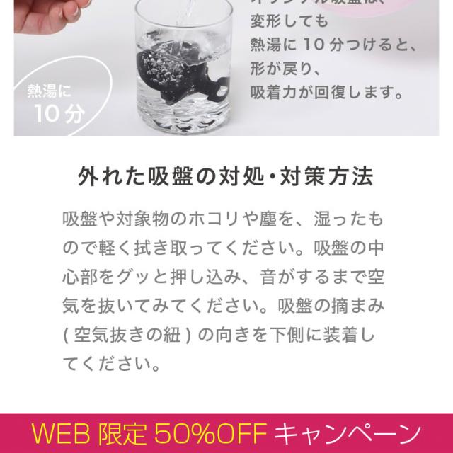 リアハッチの熱線、ガラス張り付け型アンテナ、メーカー取扱い注意シール等、吸盤吸着の妨げになるものがある場合、(別売)吸盤用ベースシールをご設置ください。※お風呂場で使うベースシールが最適です。ホームセンターでご購入いただけます。なお製品に付属しております簡易吸盤は梱包状況によって変型している場合がございます。熱いお湯に数分つけて元の形に直してからお使いください。