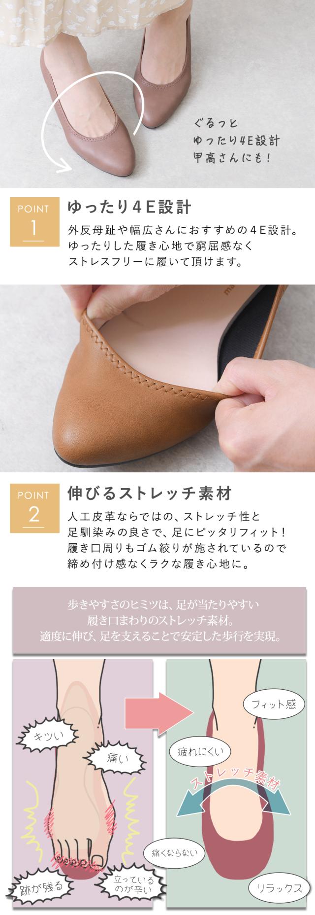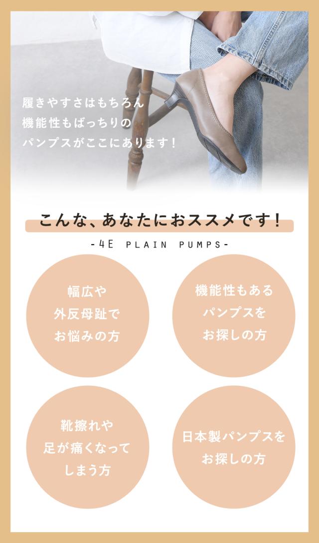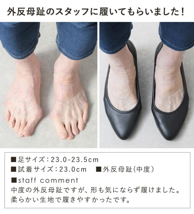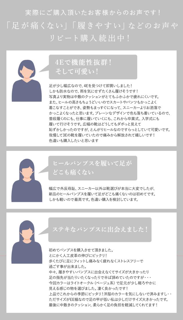 ★幅広なのでパンプスは幅が狭くてつま先が痛いことが多いのですが、生地が柔らかく履き心地がとても良いです。4Eなので、幅を気にせず本来の自分の足長でサイズが選べて嬉しいです。