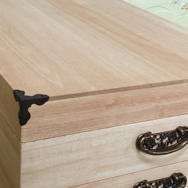 丈夫な天板と便利な取っ手6mm厚の桐無垢板を使用した、高級感溢れるフラット天板です。持ち運びに便利な取っ手付きです。 | 隅金具丁寧に打ち込んだ隅金具が高級感を醸し出しています。 |