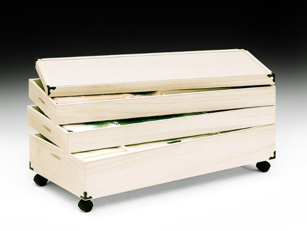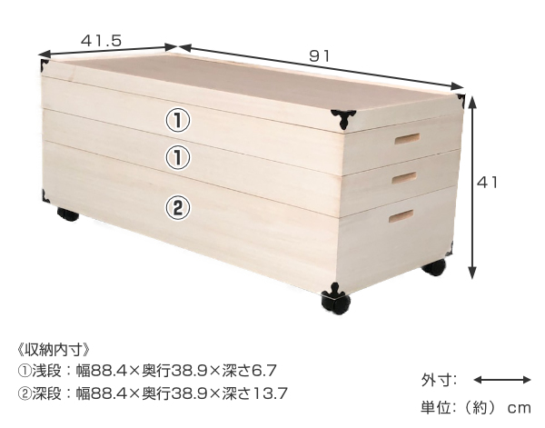 幅91cmと大きめサイズの衣装ケースは背の高い方の着物でも折らずに収納でき、折り皺がつかず長期の保管に最適です。浅段は着物をたとう紙に入れたまま約2枚、深段は約4枚ずつ収納可能です。