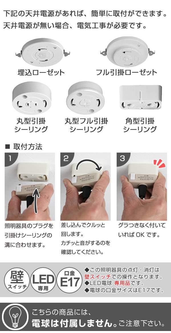 | 備考 | 点灯方法:壁スイッチ 対応電球:E17/40形相当 |