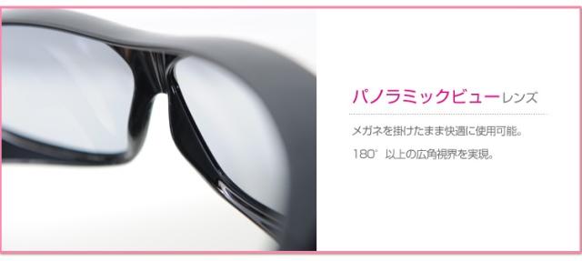 | PANORAMIC VIEW LENS パノラミックビューレンズ。サイドピラーを取りはらい180°以上の広角視界を実現。 幅広のメガネが入るように設計されているので市販のほとんどのメガネの上から無理なく使用できます。 |