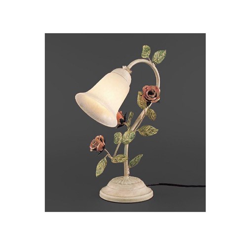 スカボ風ガラスのセードとアイアン細工のバラが可愛らしいデザインのスタンドです。スカボガラスとはイタリア語の「SCAVO=発掘」が語源の、ざらざらとした独特の質感を持つガラスの事。光が屈折し、やわらかな明かりが広がります。フィレンツェスタイル特有のクラフトマンシップにより、形づくりからはけ塗りまで手作業でひとつひとつ丹念にしあげられたアイアン細工は、アンティークのような風合いです。