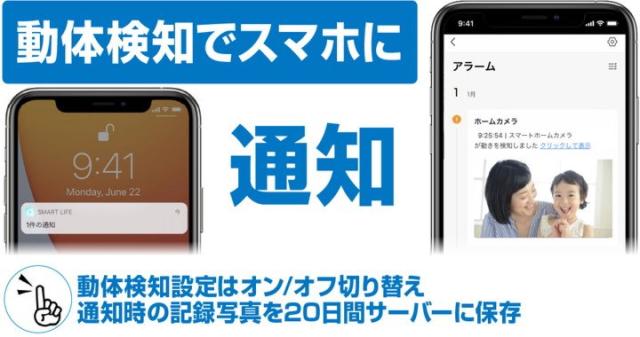 ●動体通知で記録写真撮影とスマホへの通知が可能。