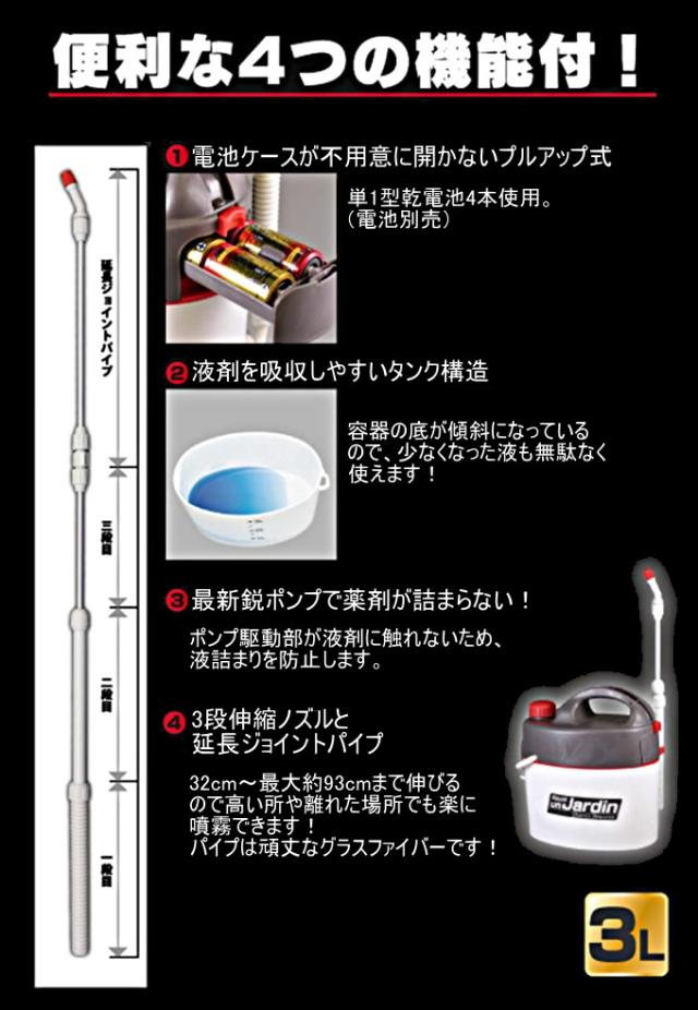 | 特徴 | モーターポンプ搭載の電池式噴霧器。 最新鋭ポンプで薬剤詰まりを解消。 ポンプ駆動部が液剤に触れないため、液詰まりを防止します。 電池ケースが不用意に開かないプルアップ式。(単1型乾電池4本使用。) 液剤を吸収しやすいタンク構造。 容器の底が傾斜になっているので少なくなった液も無駄なく使えます。 3段伸縮ノズルと延長ジョイントパイプで32〜最大約93cmまで伸びるので高い場所でも楽に噴霧できます。 |