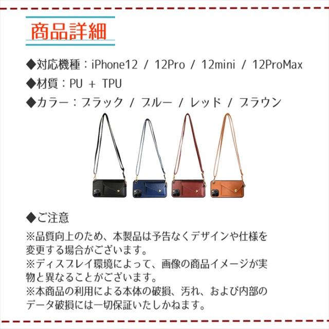 iPhone12シリーズに対応したオシャレなロングストラップ付きスマホカバーです・コーデが引きしまる!長さを調節できるストラップ付きだから身体にジャストフィット!・レザー調のメンズライクなデザインはセンスが際立ちます。・コーデに映えて、カッコいい!・イマドキ女子や毎日忙しいママに人気。背面にカードや小銭などを入れられる収納付きタイプ!・コンビニへ買い物、近くのカフェへお散歩、リュックでお出かけ、子供と公園で遊ぶ時など様々な場面に颯爽と出かけられる便利なポーチタイプ!・高見えするきれいなPUレザー・高品質素材は汚れがつきにくくお手入れがラク!・それぞれの機種に合わせてカメラ周り、充電口やボタンなどが作られているから操作性はバッチリ!・本体を落下の衝撃から守ります・センスの良さを感じさせるレザー調の大人デザイン、シックで魅力的な4カラー!※ディスプレイ環境によって、画像の商品イメージが実物と異なることがございます●カラーブラック / ブルー / レッド / ブラウン●対応機種・iPhone 12 mini・iPhone 12 / 12Pro・iPhone 12 Pro Max●素材: TPU、PUレザー