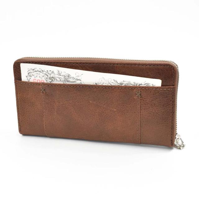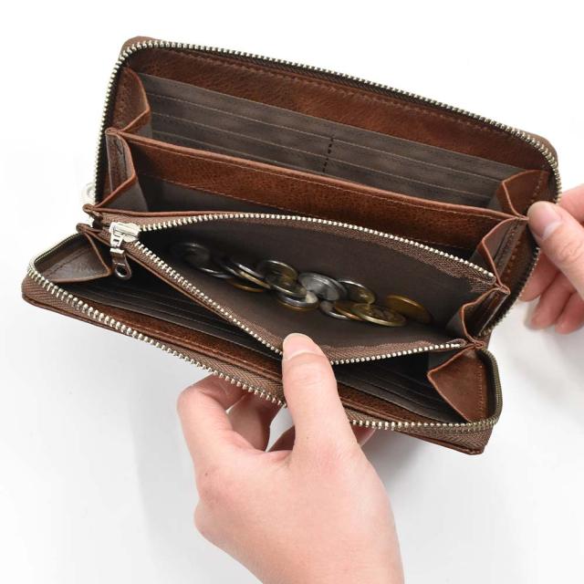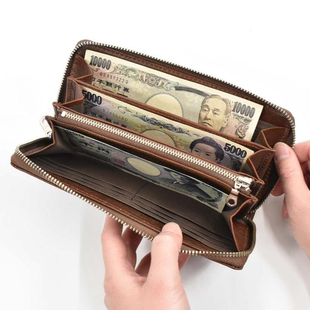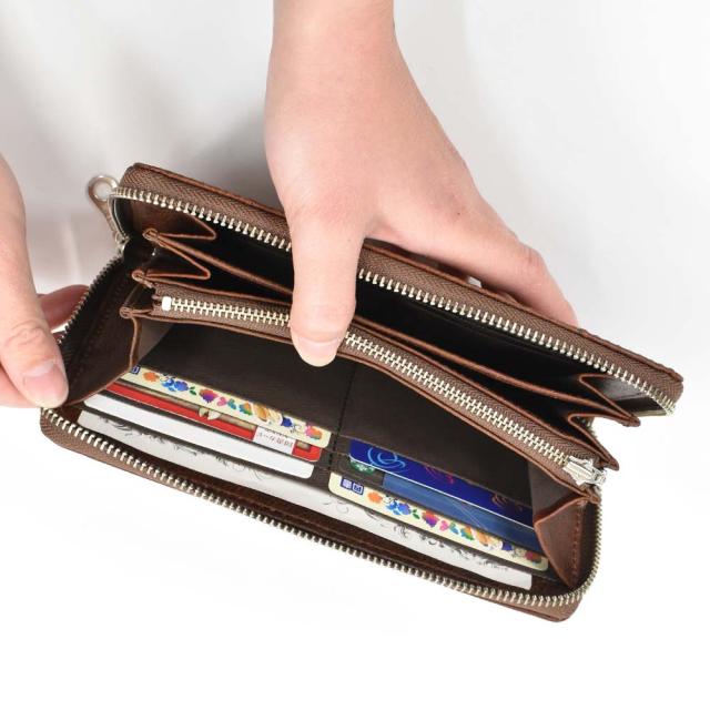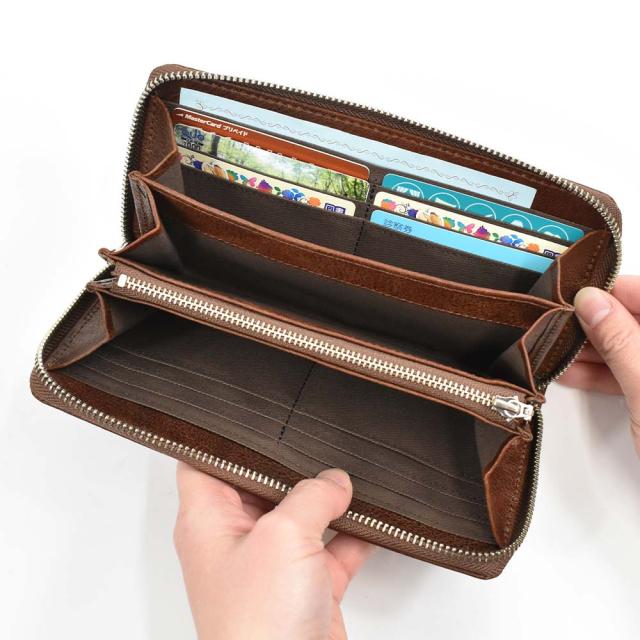 抜群の収納力を誇るラウンドファスナー型の長財布。カードポケット×12、札入れ×3、フリーポケット×3、小銭入れ×1を備えています。